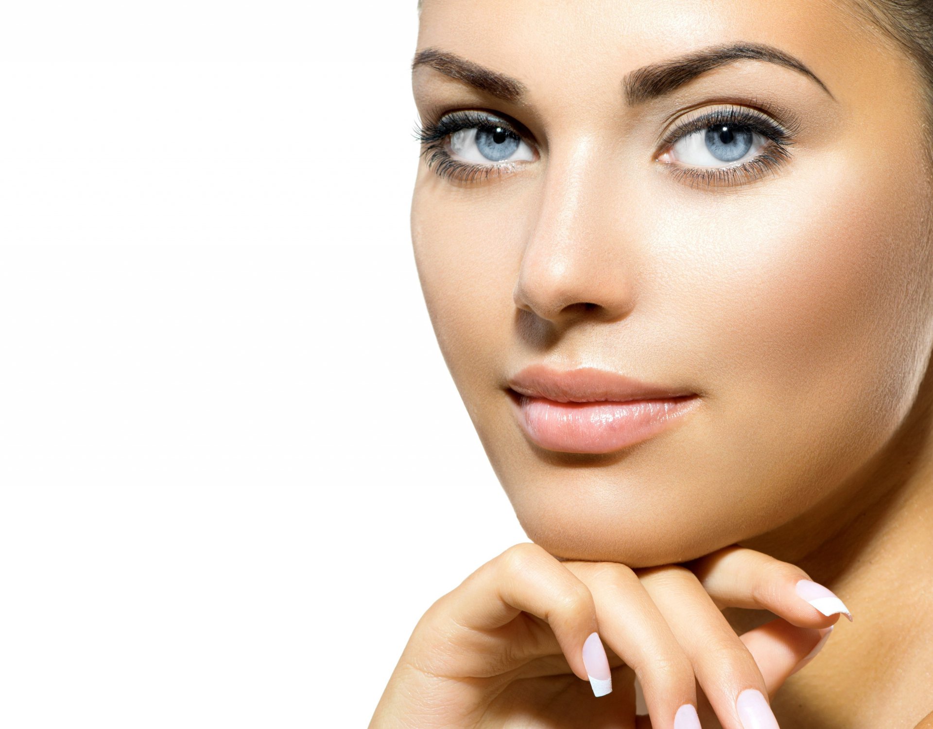 Девушка с безупречным лицом и голубыми глазами на белом фоне - обои на рабочий стол