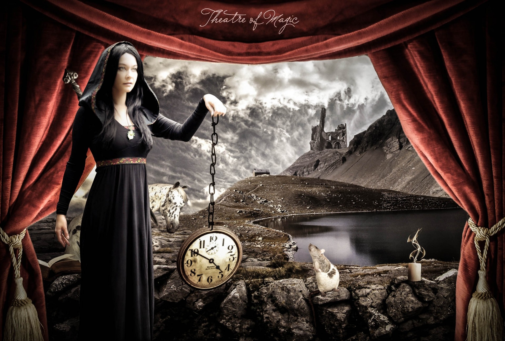 Девушка с часами рядом с мышью, позади лошадь - обои на рабочий стол