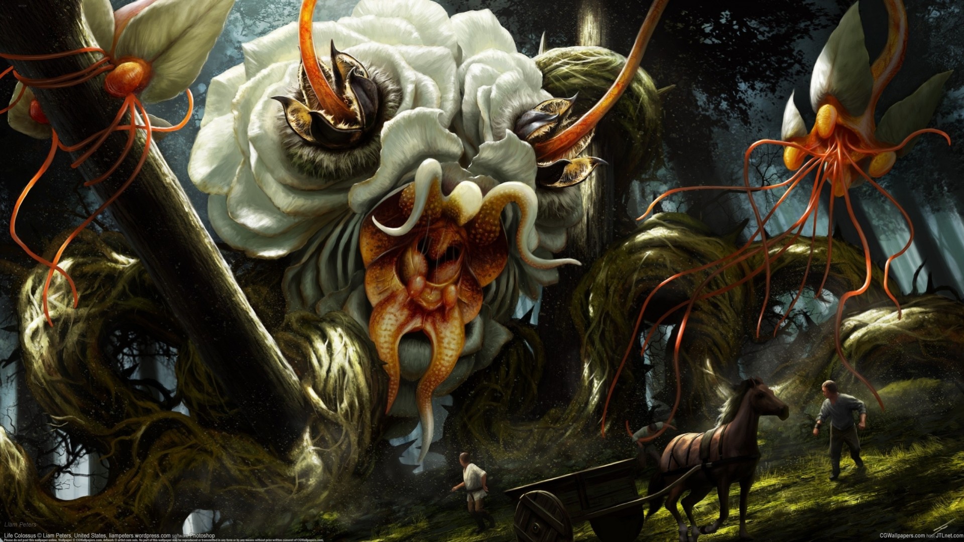 Люди и лошадь убегают от монстра - обои на рабочий стол