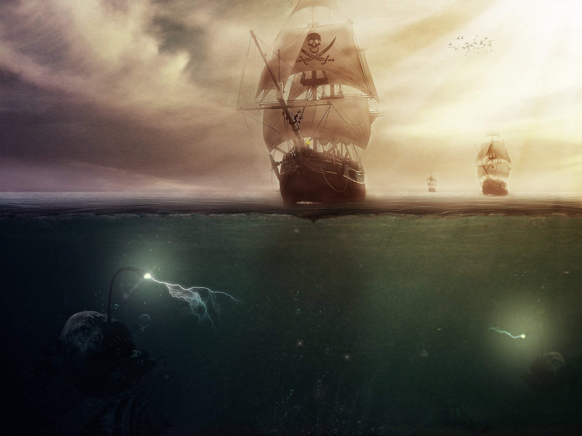Пиратская флотилия в океане чудовищ - обои на рабочий стол