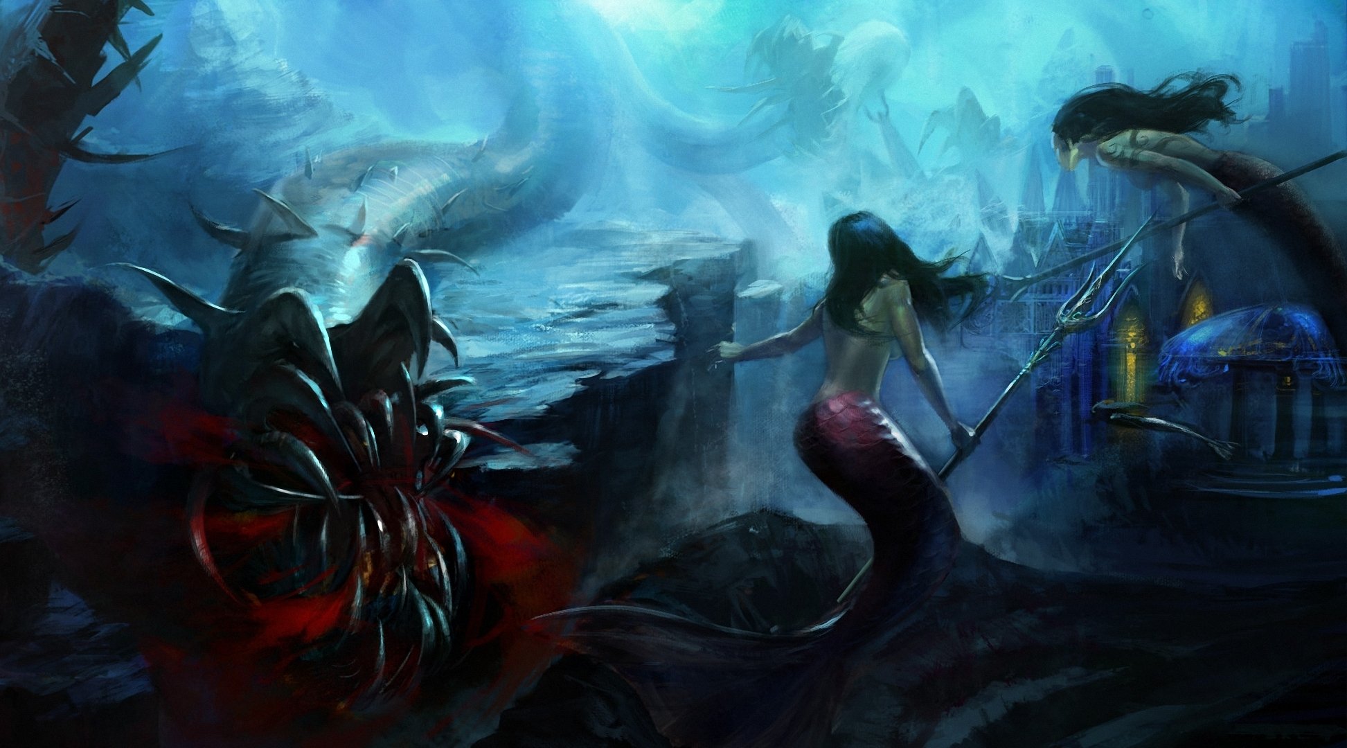 Теги:арт, mazert янг, под водой, подводный мир, монстры, пасть, русалки, оружие, трезубец, город, скалы