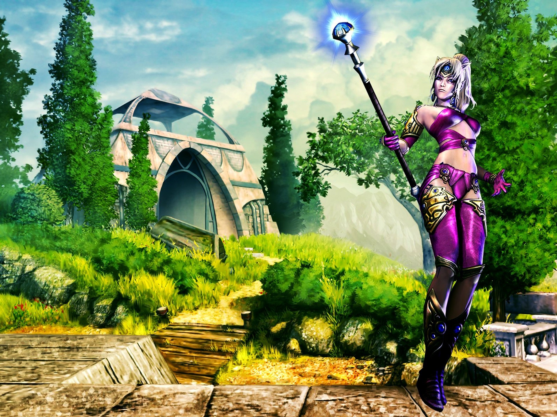 Персонаж игры в фиолетовом костюме с жезлом - обои на рабочий стол