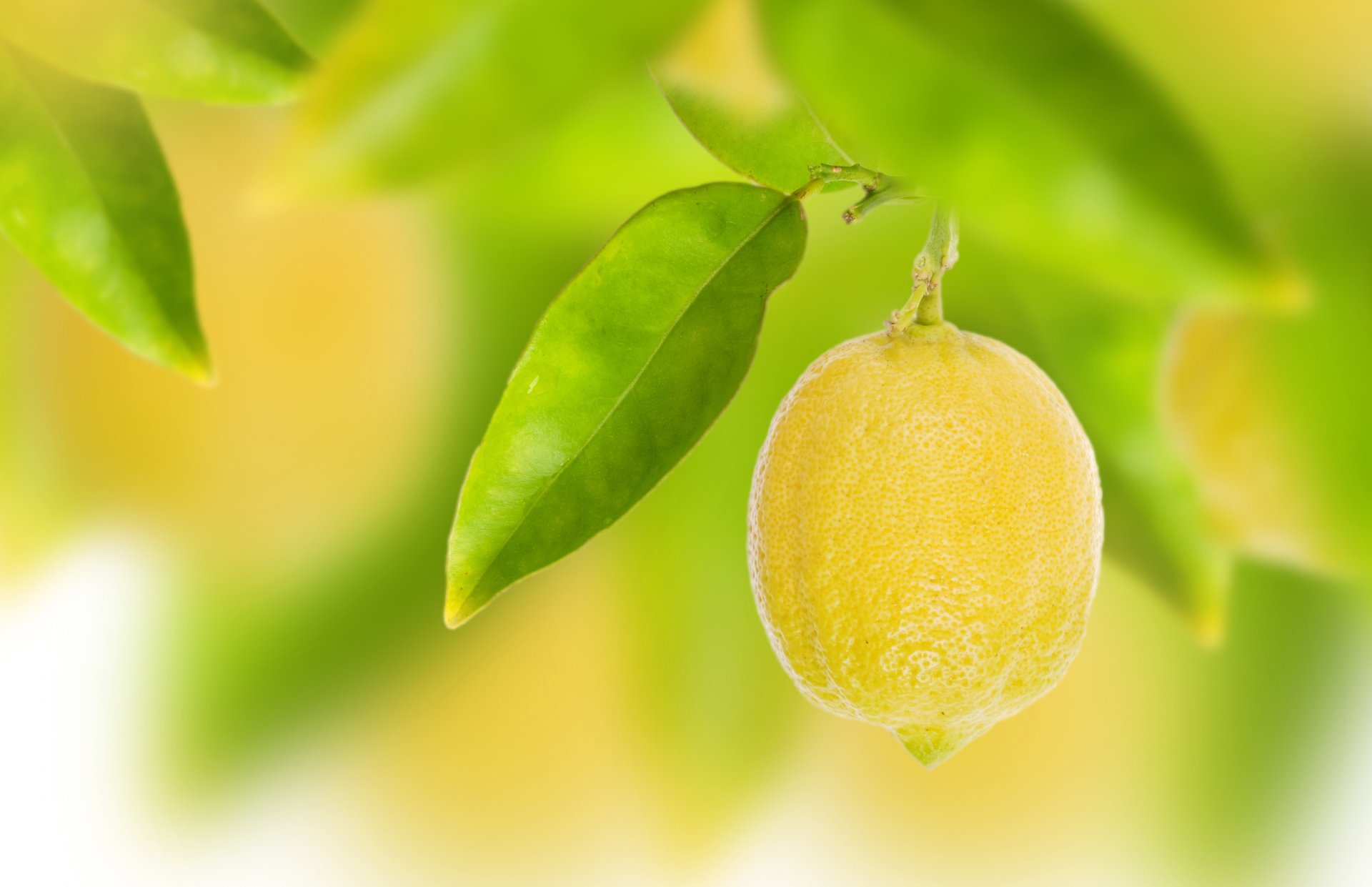Лимон с листьями на размытом фоне - обои на рабочий стол