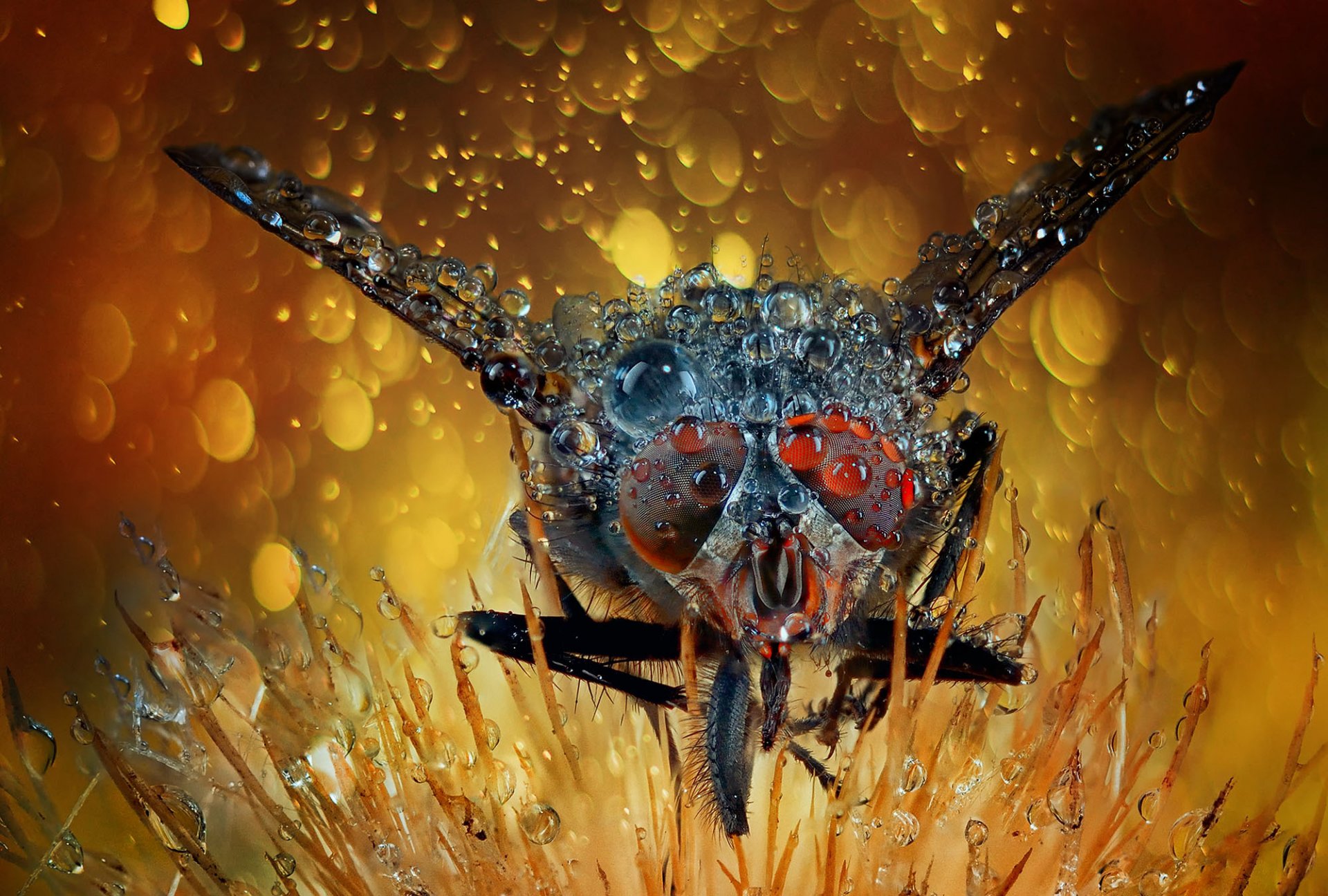 Муха села на цветок с каплями росы - обои на рабочий стол