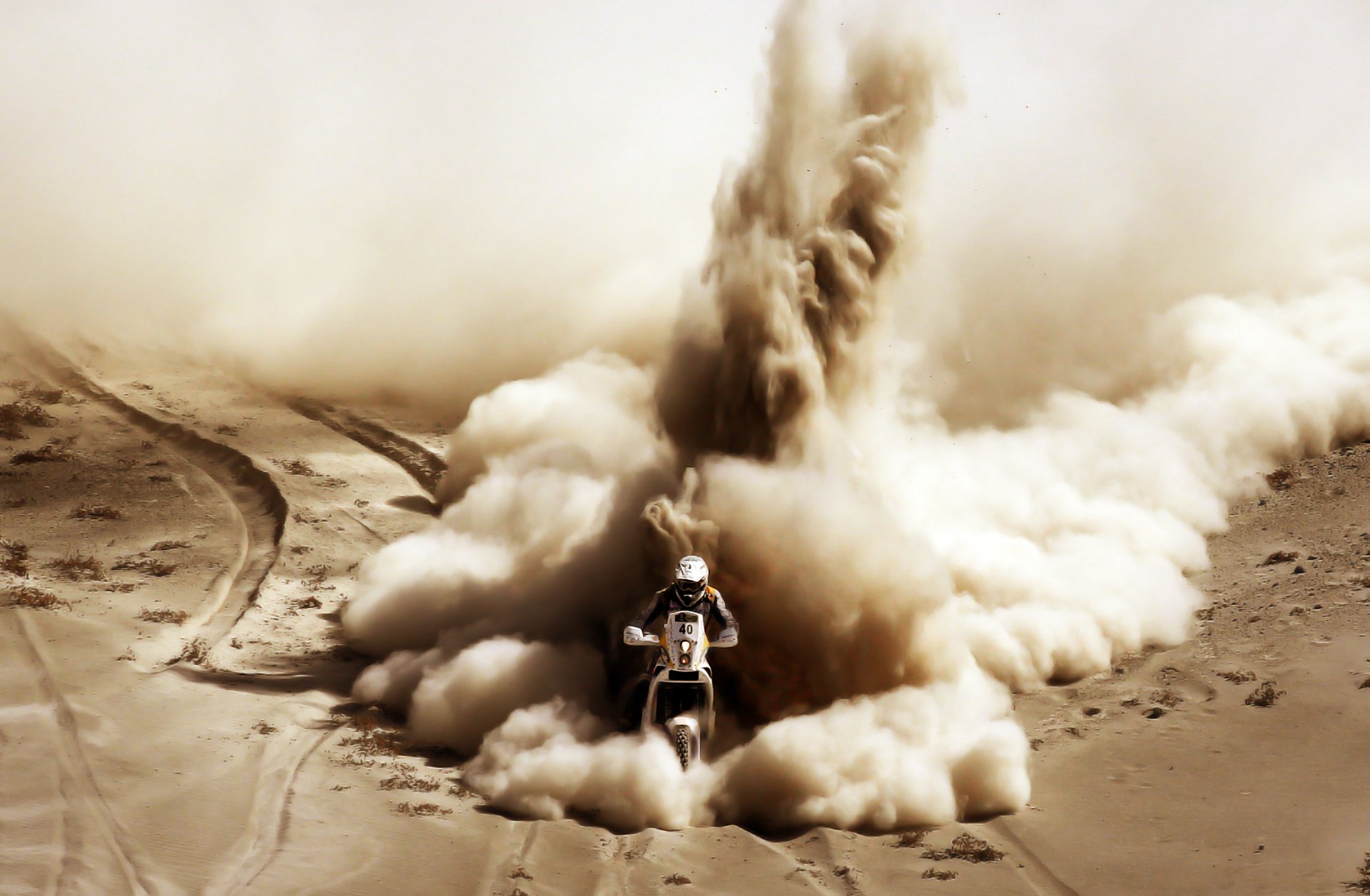 Мотоциклист едет по пустыне разгоняя песок в разные стороны огромным столбом дыма - обои на рабочий стол