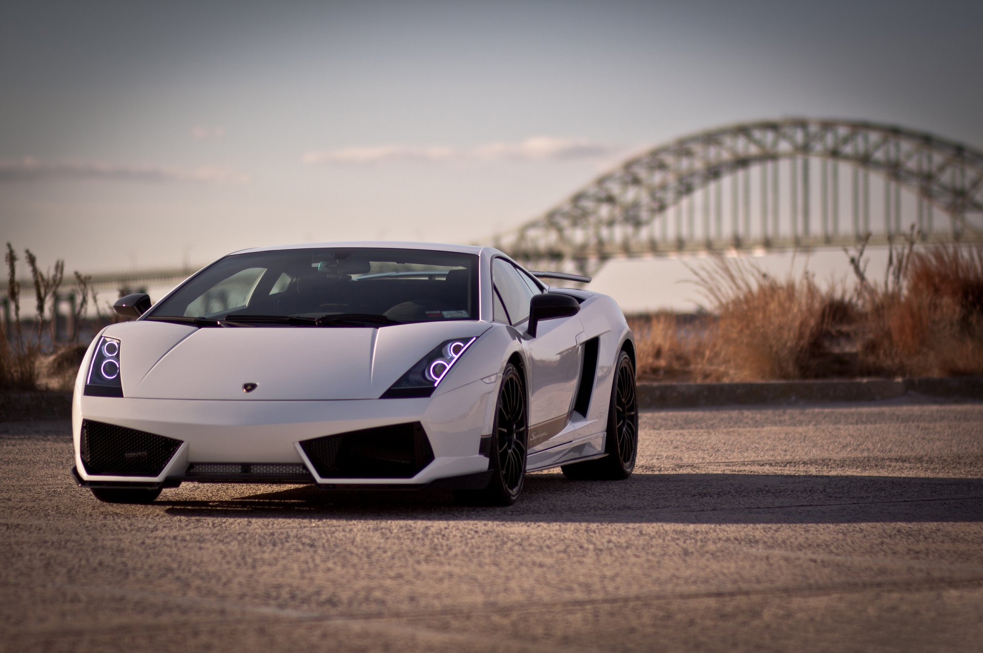 На дороге на фоне моста стоит машина - обои на рабочий стол