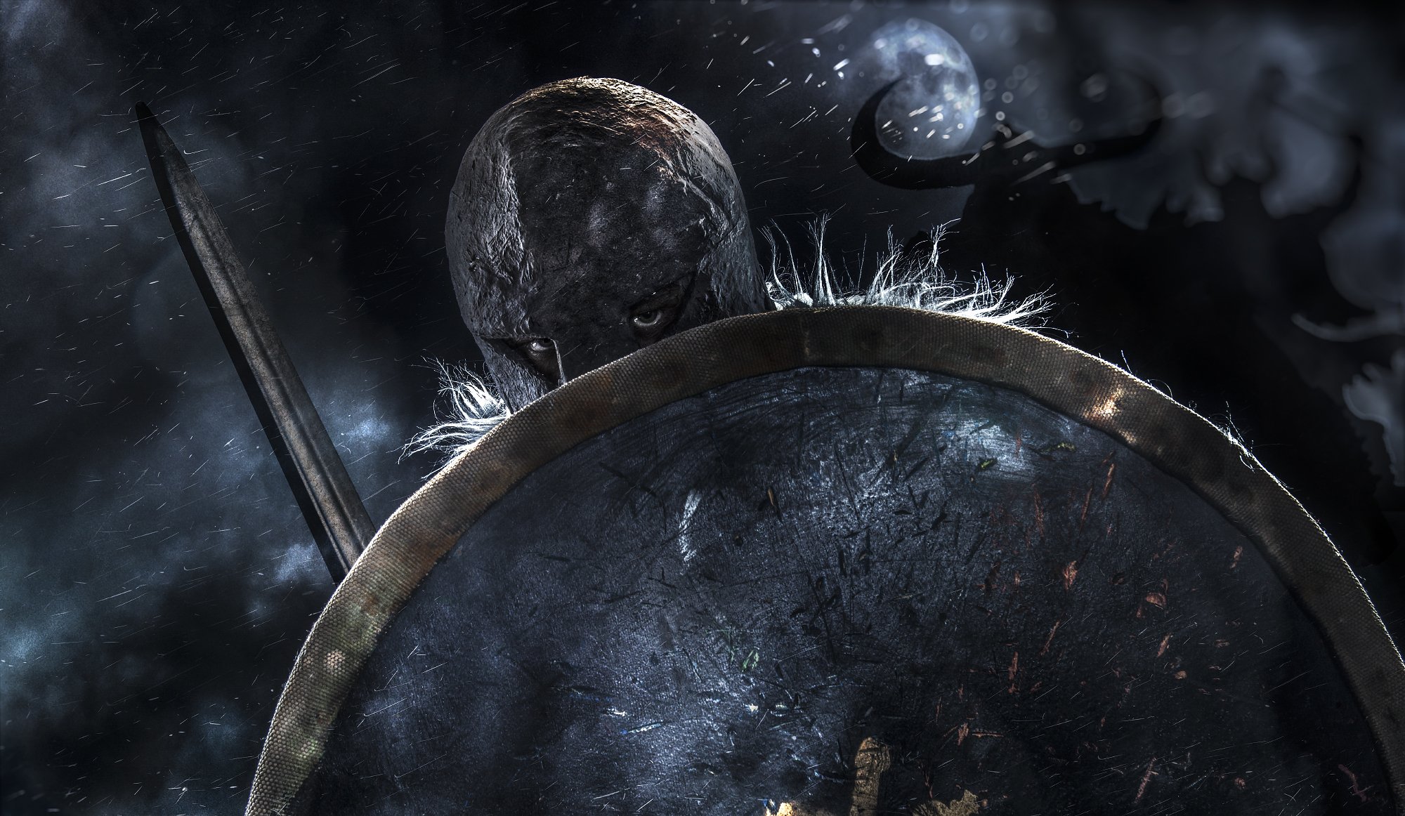 Воин с мечом и щитом во тьме - обои на рабочий стол