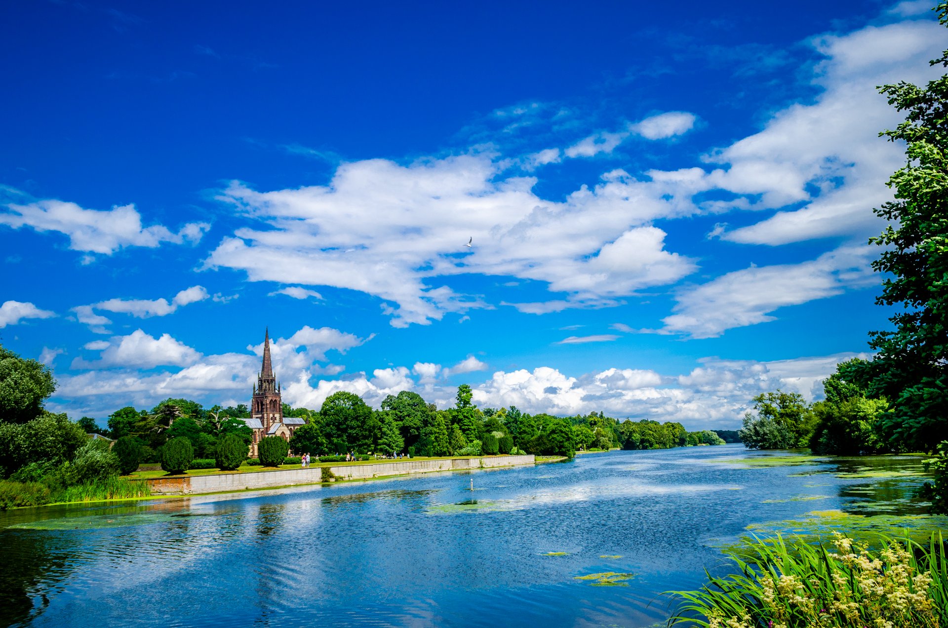 Теги:церковь, святой девы марии, в clumber park, ноттингемшир, деревья, зелень, озеро, чайка, небо, облака