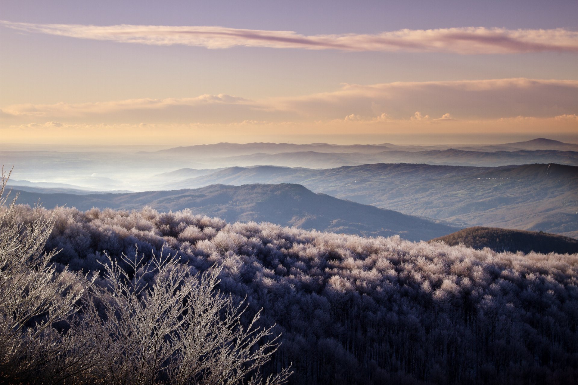 Лесные холмы покрытые утренним иниемОтражение пейзажа - обои на рабочий стол