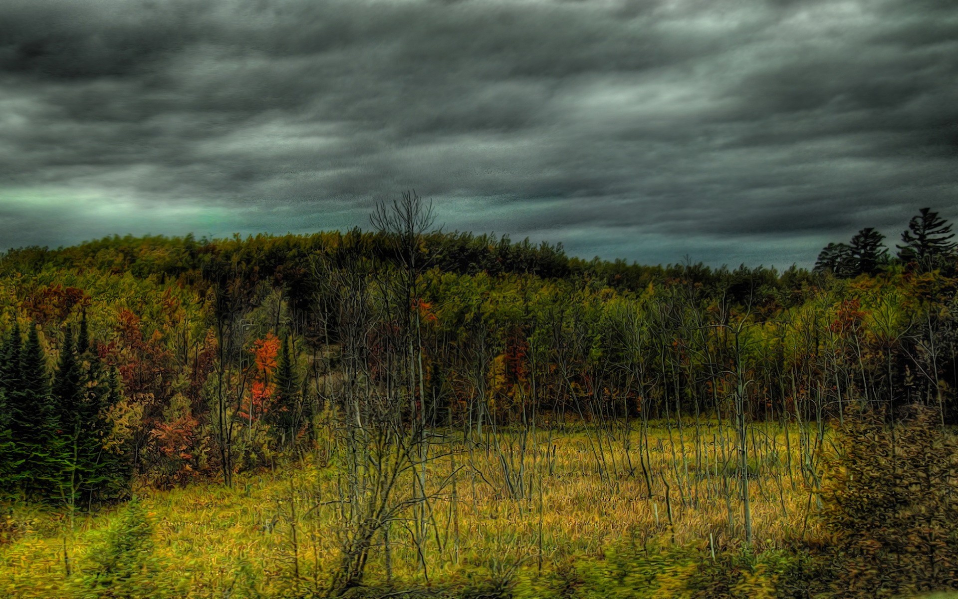 Темные облака над осенним лесом - обои на рабочий стол