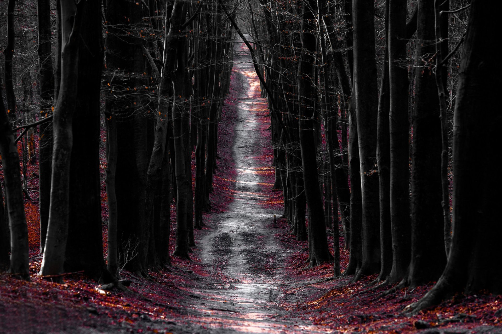 Дорога идущая через лес с деревьями - обои на рабочий стол