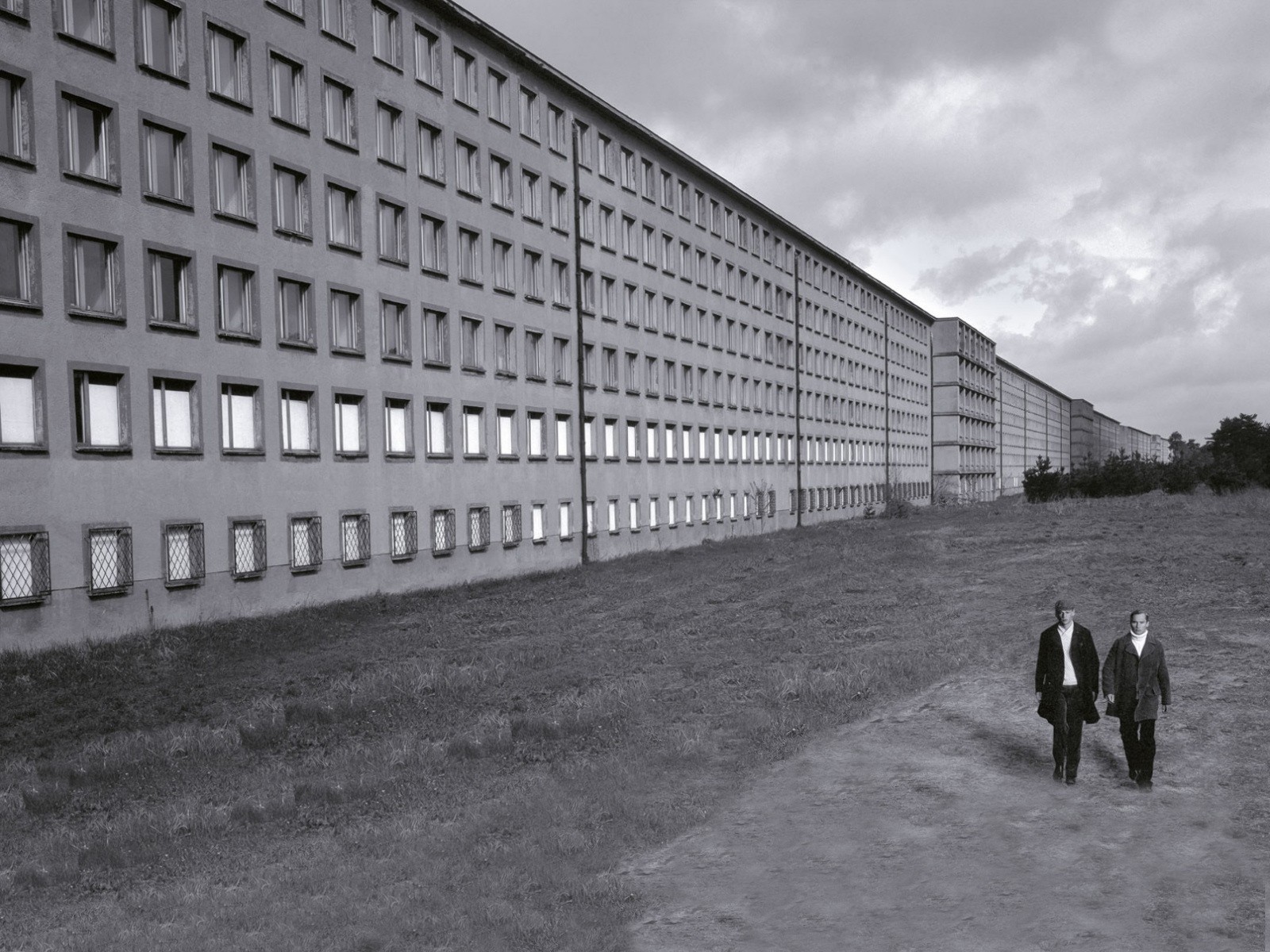 Длинное здание, вдоль которого идут два человека - обои на рабочий стол