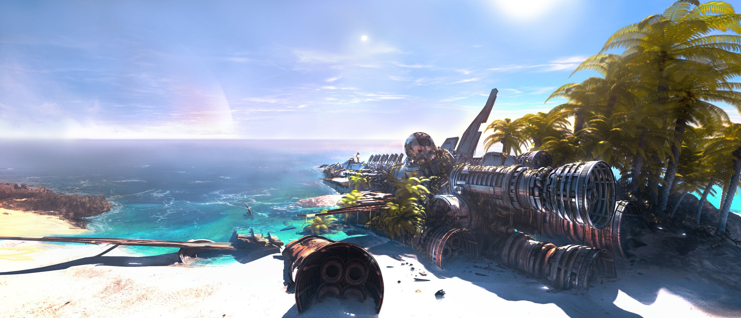 Арт крушения космического корабля на фоне спокойного моря и песчаного берега - обои на рабочий стол