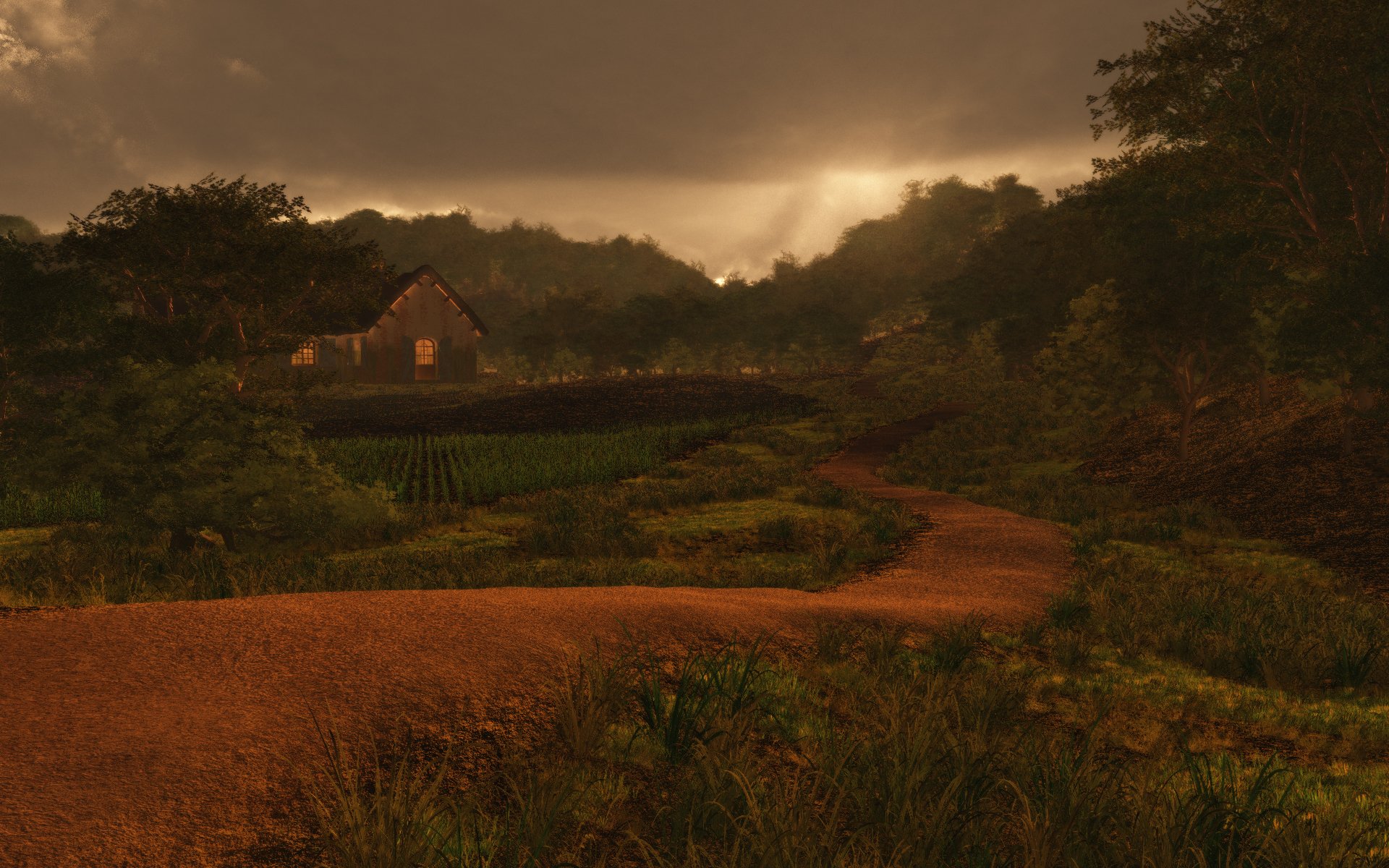 Теги:арт, дом, постройки, дорога, дорожка, поля, пасмурно, облака
