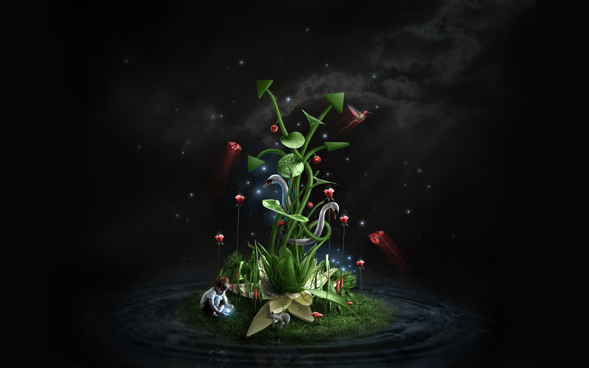 светлячки бабочки лебеди цветы белка ребенок