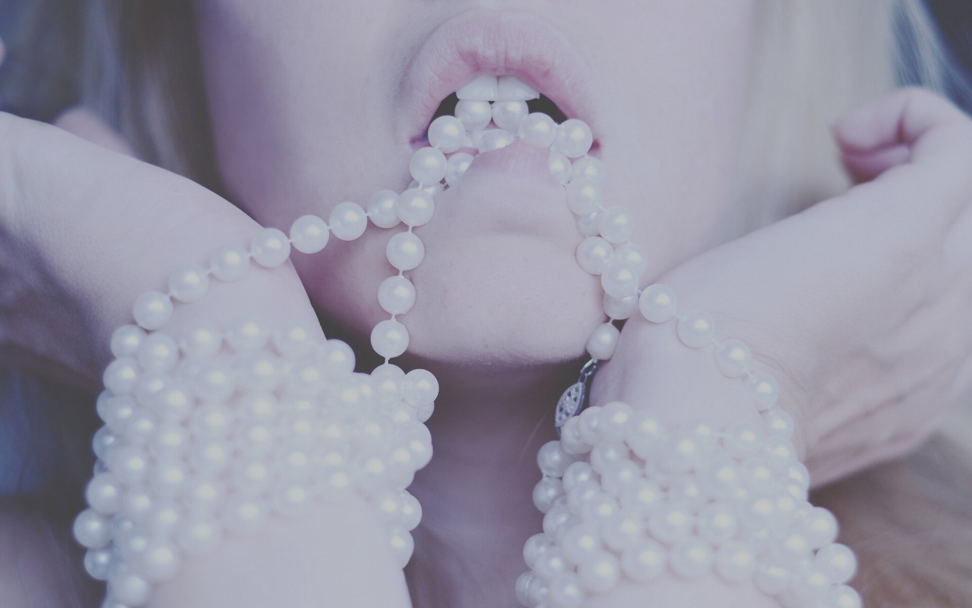 Девушка кусает нитку с жемчугом - обои на рабочий стол