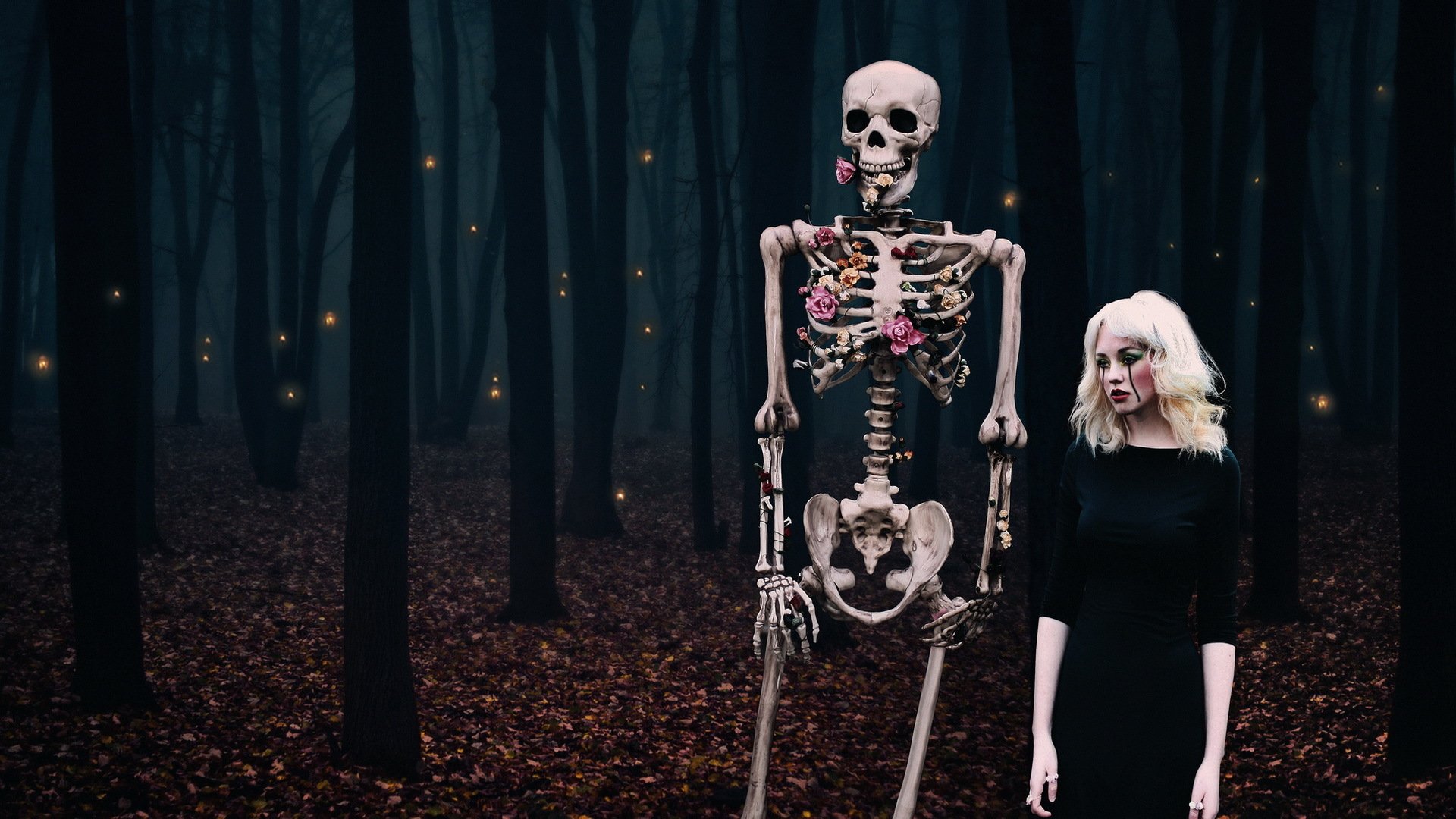 Девушка и скелет в цветах в лесу - обои на рабочий стол