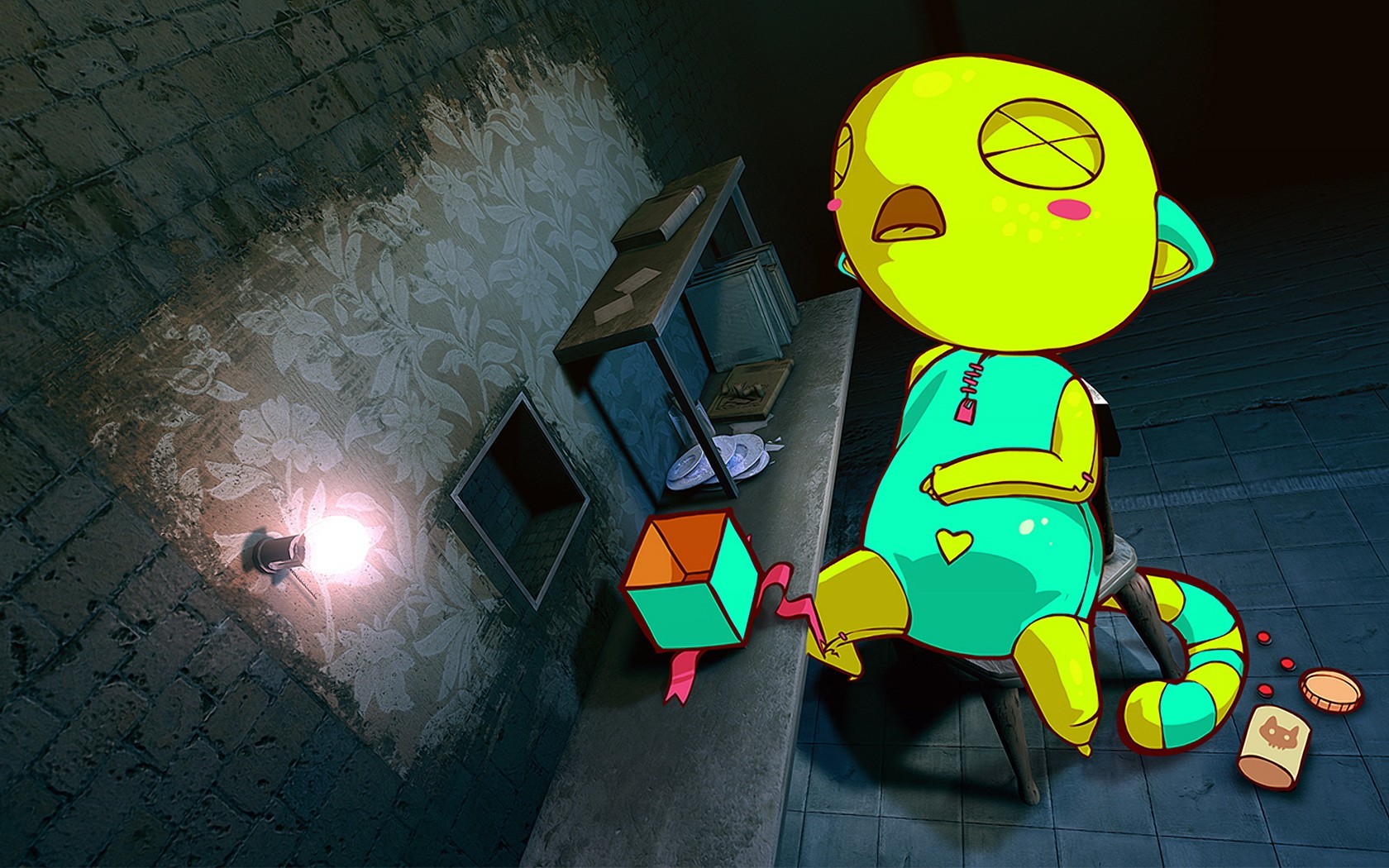 Горящая лампочка над столом за которым сидит спящий мультяшный кот - обои на телефон