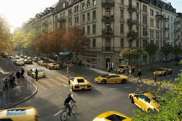 Желтые клоны lamborghini на перекрестке