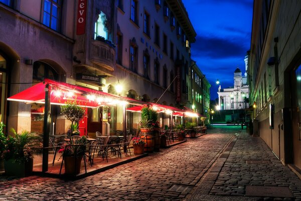 Вечерняя улица с рестораном в Финляндии Хельсинки