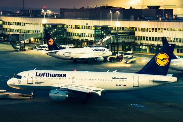 Авиалайнер А 380 ночью на зимнем аэродроме