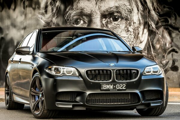Чёрная BMW m5 на фоне картины
