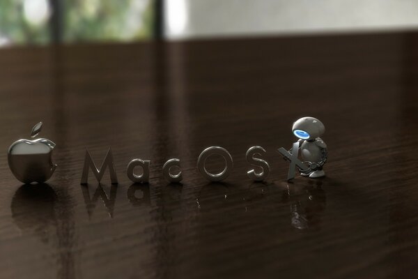Маленький робот выставляет надпись из букв macos на столеМаленький робот выставляет надпись из букв MacOS на столе