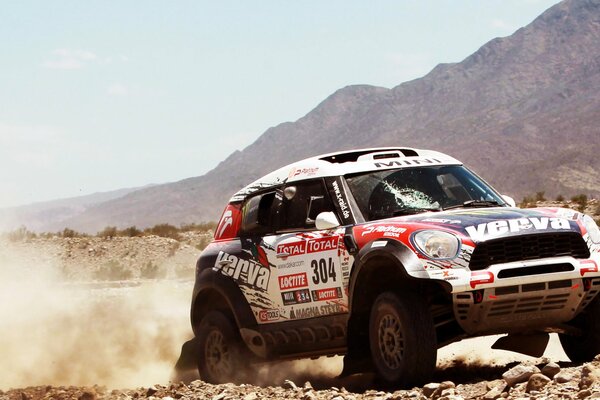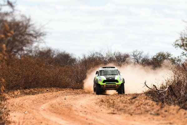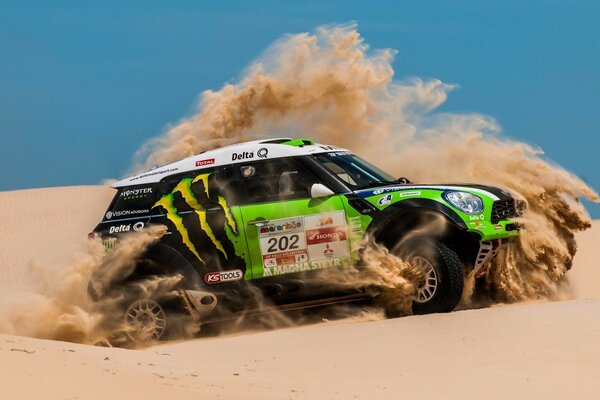Зелёный автомобиль mini cooper в пыли участие в ралли