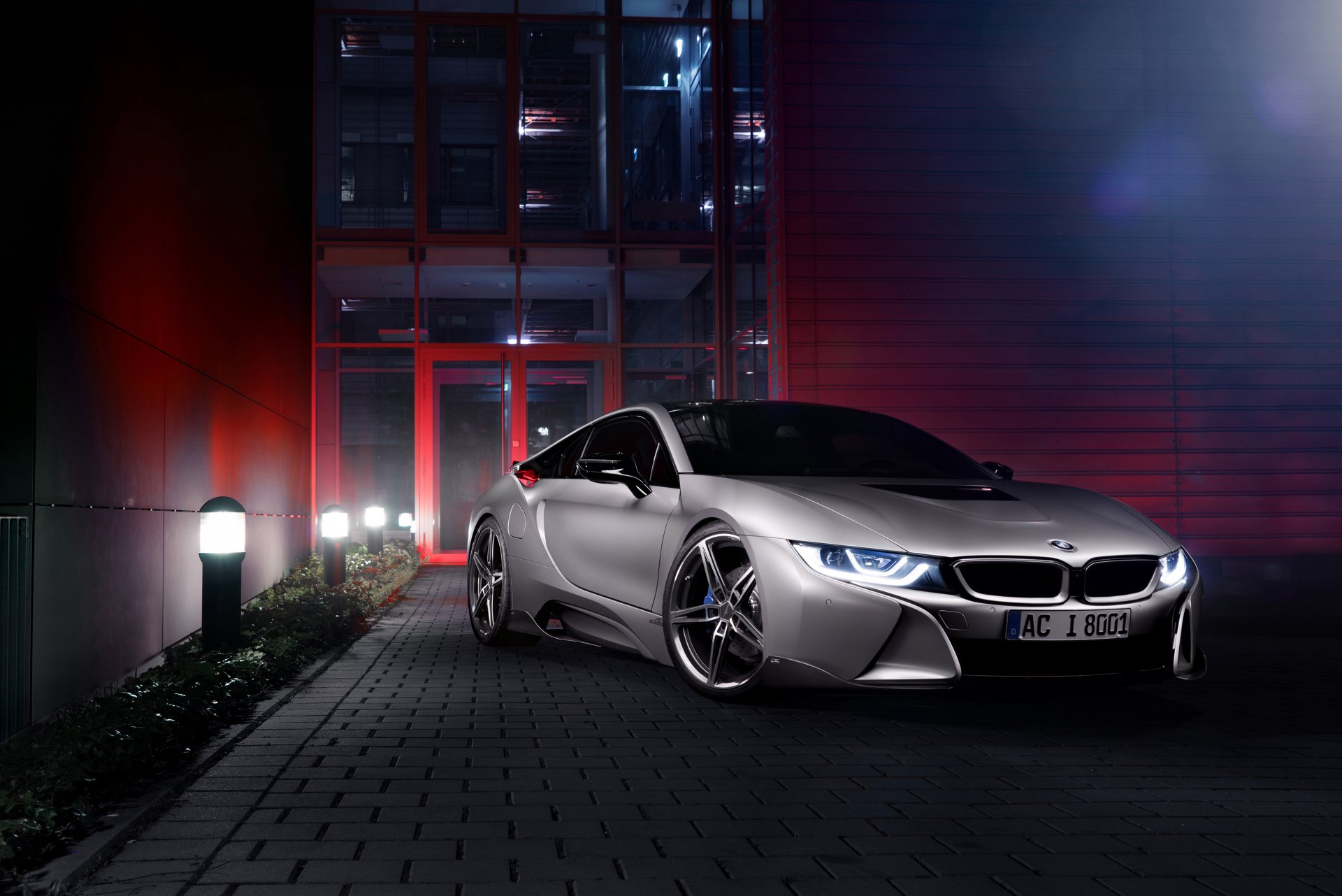 BMW i8 в сером цвете на фоне здания с красной подсветкой