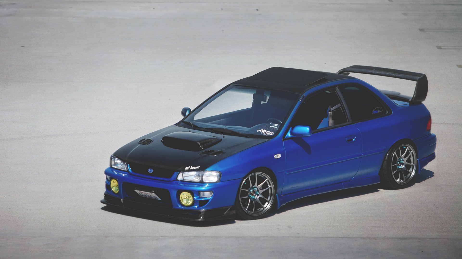 На трассе на фоне леса несётся на полной скорости субару импреза
