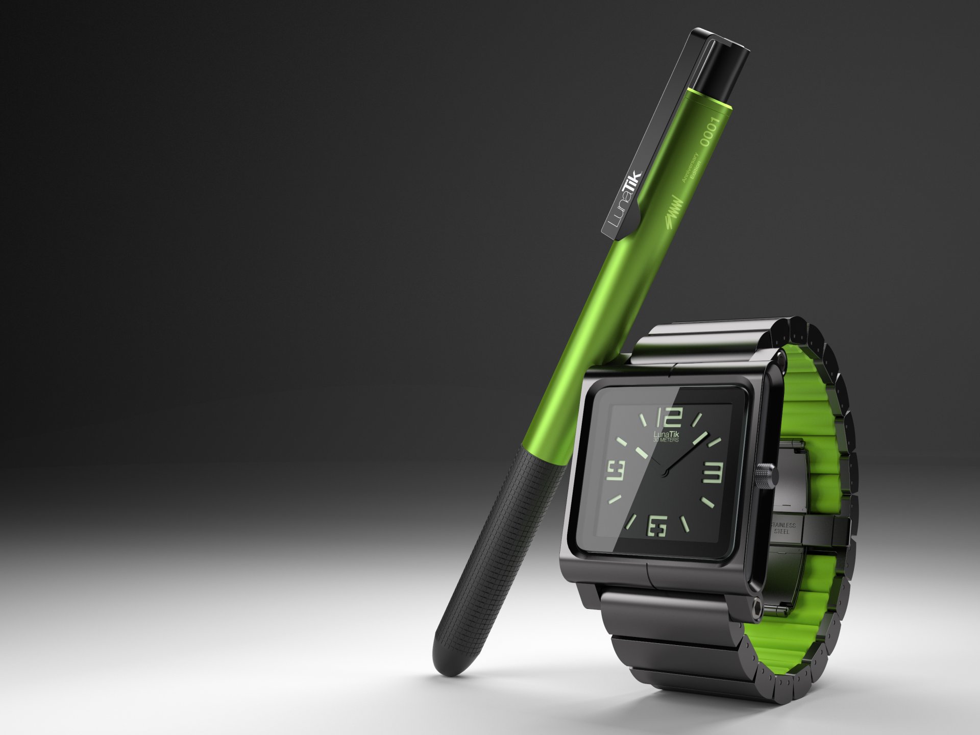 Чёрные часы и ручка с зелёной вставкой - обои на рабочий стол