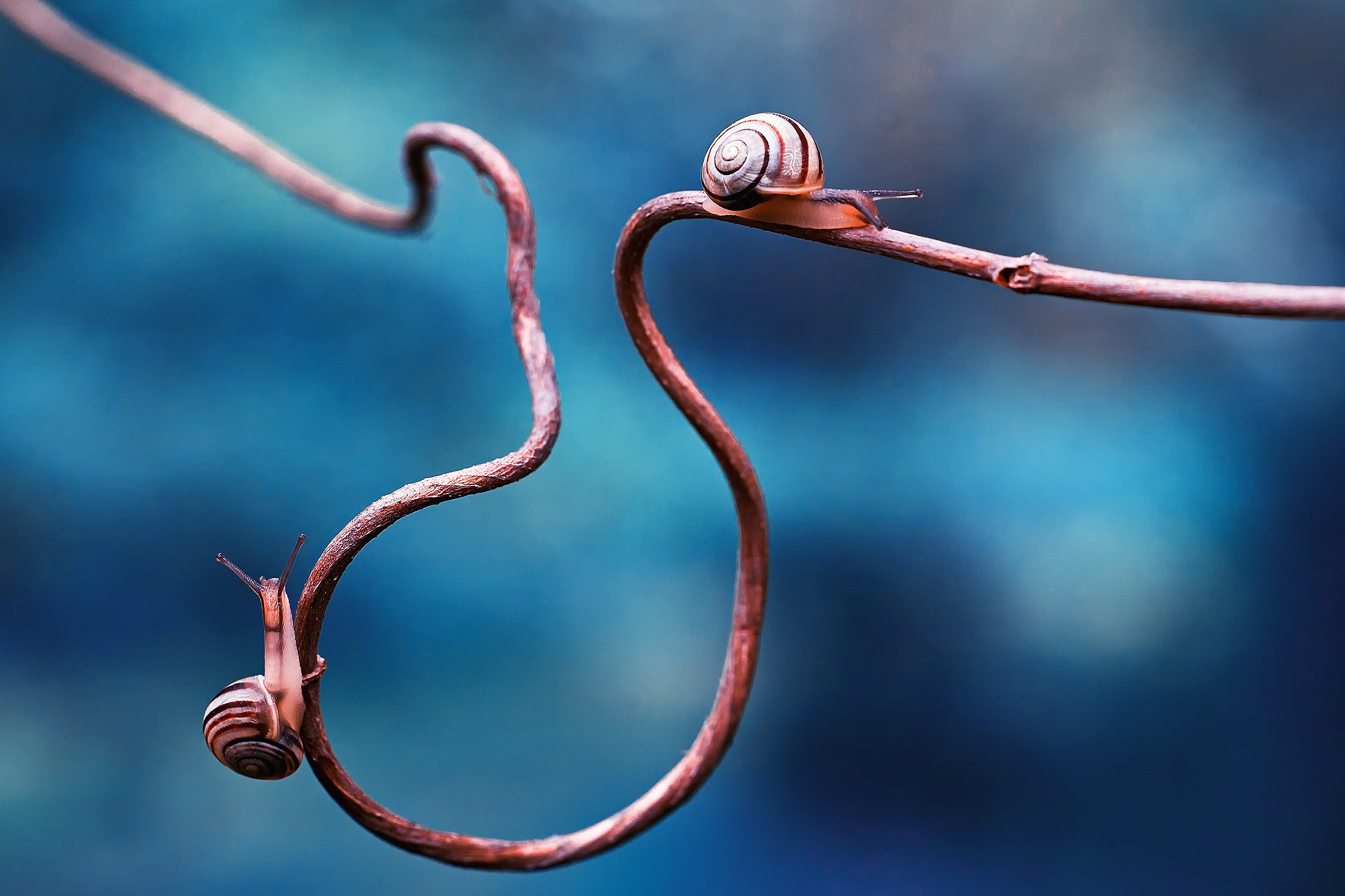 Две улитки на искривленной ветке - обои на рабочий стол
